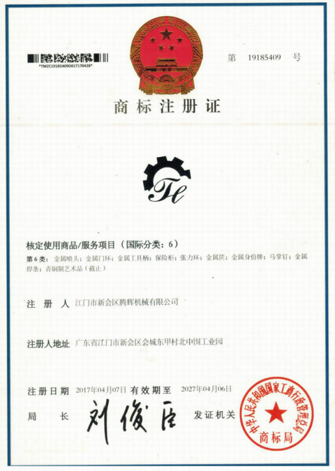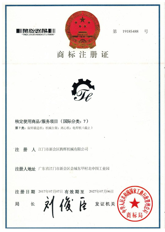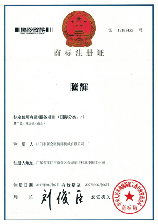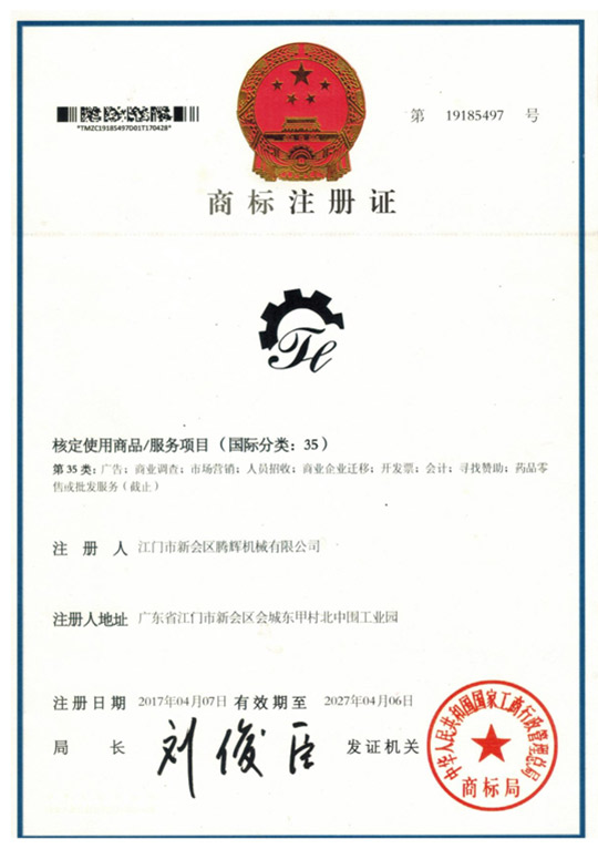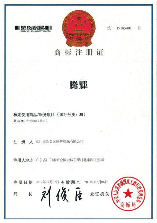 江門(mén)市新會(huì)區(qū)騰輝機(jī)械有限公司獲得國(guó)家商標(biāo)局的認(rèn)可圖形商標(biāo)和文字商標(biāo)穩(wěn)固的品牌地位,樹(shù)立了良好的企業(yè)形象。