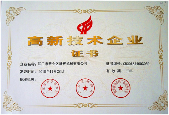 一直以來江門市新會(huì)區(qū)騰輝機(jī)械有限公司堅(jiān)持勇于創(chuàng)新,突破常規(guī),永不止步,敢于研發(fā)的精神,在全體員工的努力下本公司獲得“高新技術(shù)企業(yè)”。感謝政府對我們企業(yè)的技術(shù)認(rèn)可與支持,將來我們公司繼續(xù)堅(jiān)持技術(shù)創(chuàng)新為廣大的金屬成型生產(chǎn)企業(yè)降低生產(chǎn)難度,增加生產(chǎn)效率。